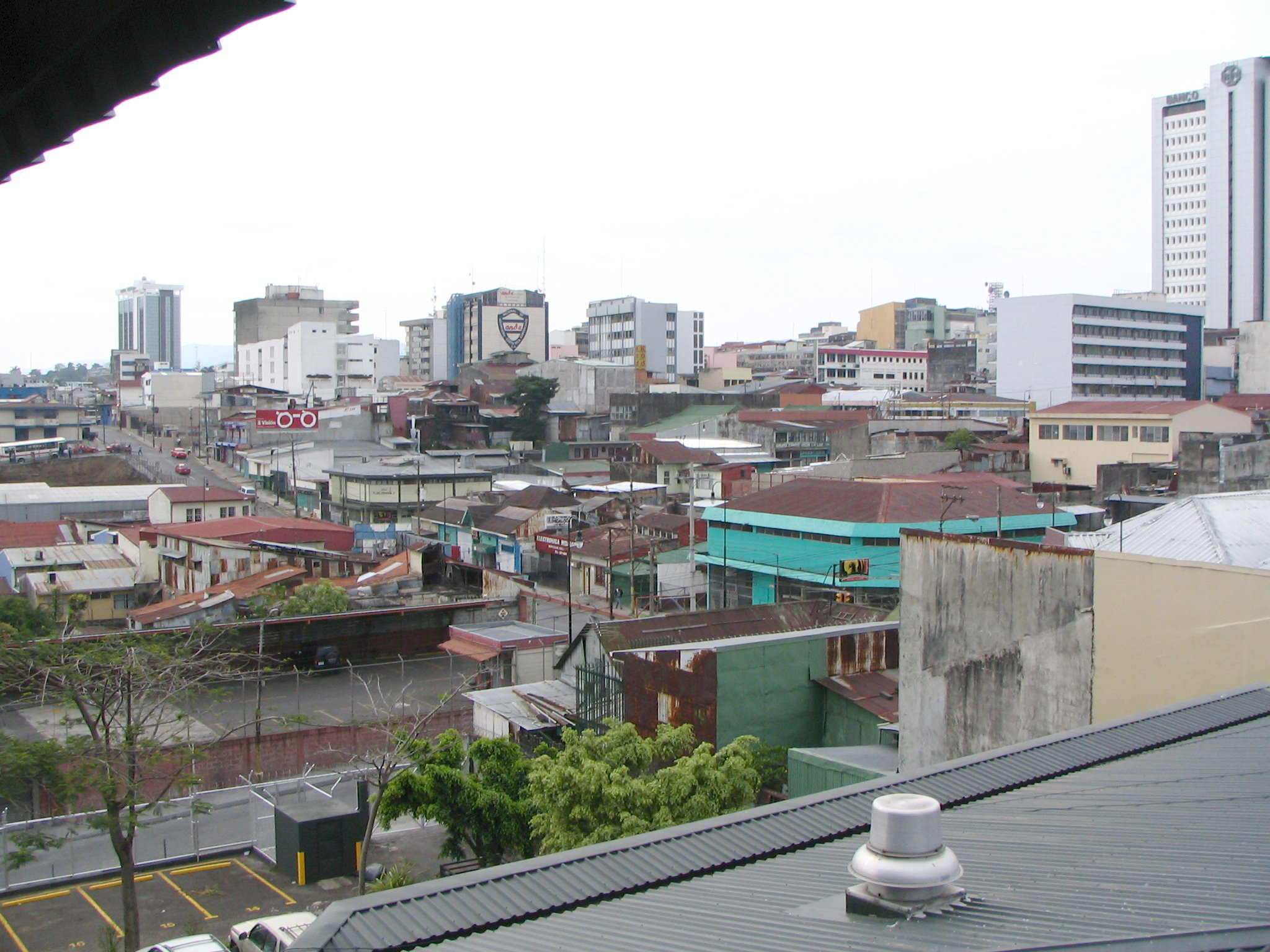 San Jose - Coming Into The Country Our motel, which we affectionately called the "Worst Western," was located in a rough area of town, to say the least. The motel was centrally located, it just happened to be in the "combat zone." In fact, the rough condition of the hotel surroundings encouraged us to leave very early each morning, and return late in the evening. These was always a doorman / guard waiting for us. The view behind the motel was even more special than the front view. Located behind the motel, and now a children's museum, this used to be the state prison. The mountains that surround the city of San Jose can be seen in this picture. Anywhere you want to go, usually involves crossing one or more of these mountain ranges. The hotel itself wasn't bad, here is the restaurant area, right next to the pool. The area surrounding the hotel was not so great. Return |
